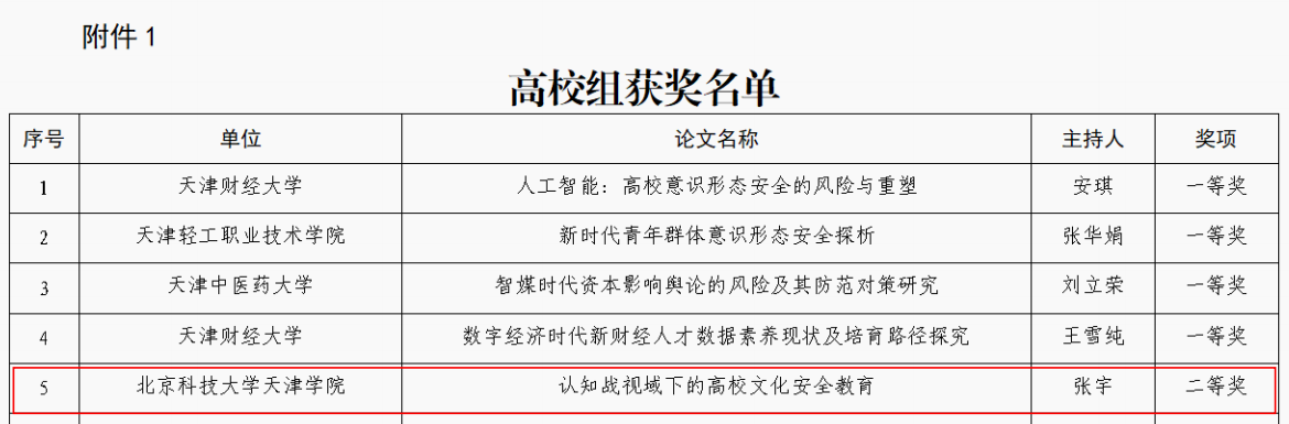 近日,天津市教育两委公布全面加强国家安全教育论文获奖名单,mg4355官网教师张宇撰写的论文《认知战视域下的高校文化安全教育》荣获市级二等奖第一名。